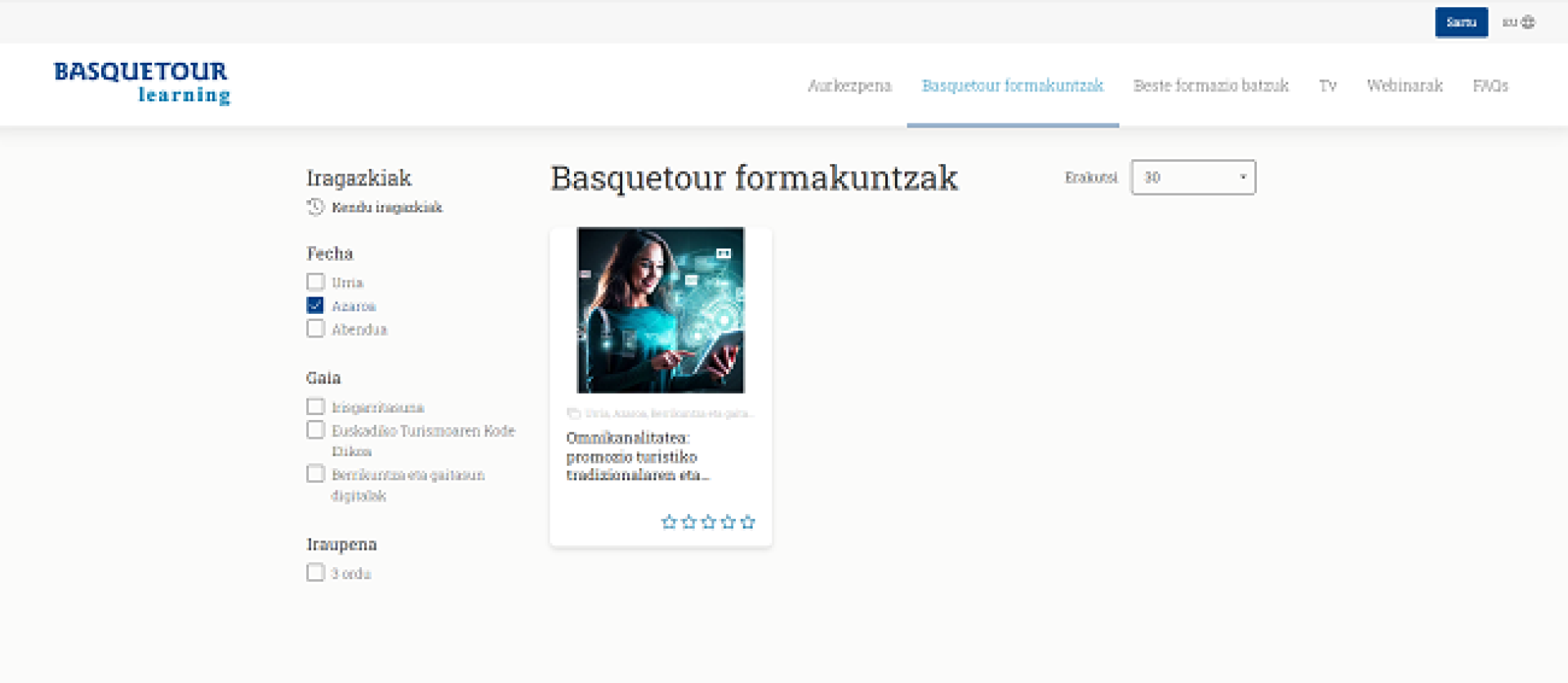 Toda la información más detallada, así como las fechas y maneras de inscribirse, están publicadas en el apartado Basquetour Learning de la web de Basquetour. Tanto las organizadas por la Agencia: Formaciones Basquetour | Basquetour Learning, como las de otras entidades: Otras formaciones | Basquetour Learning